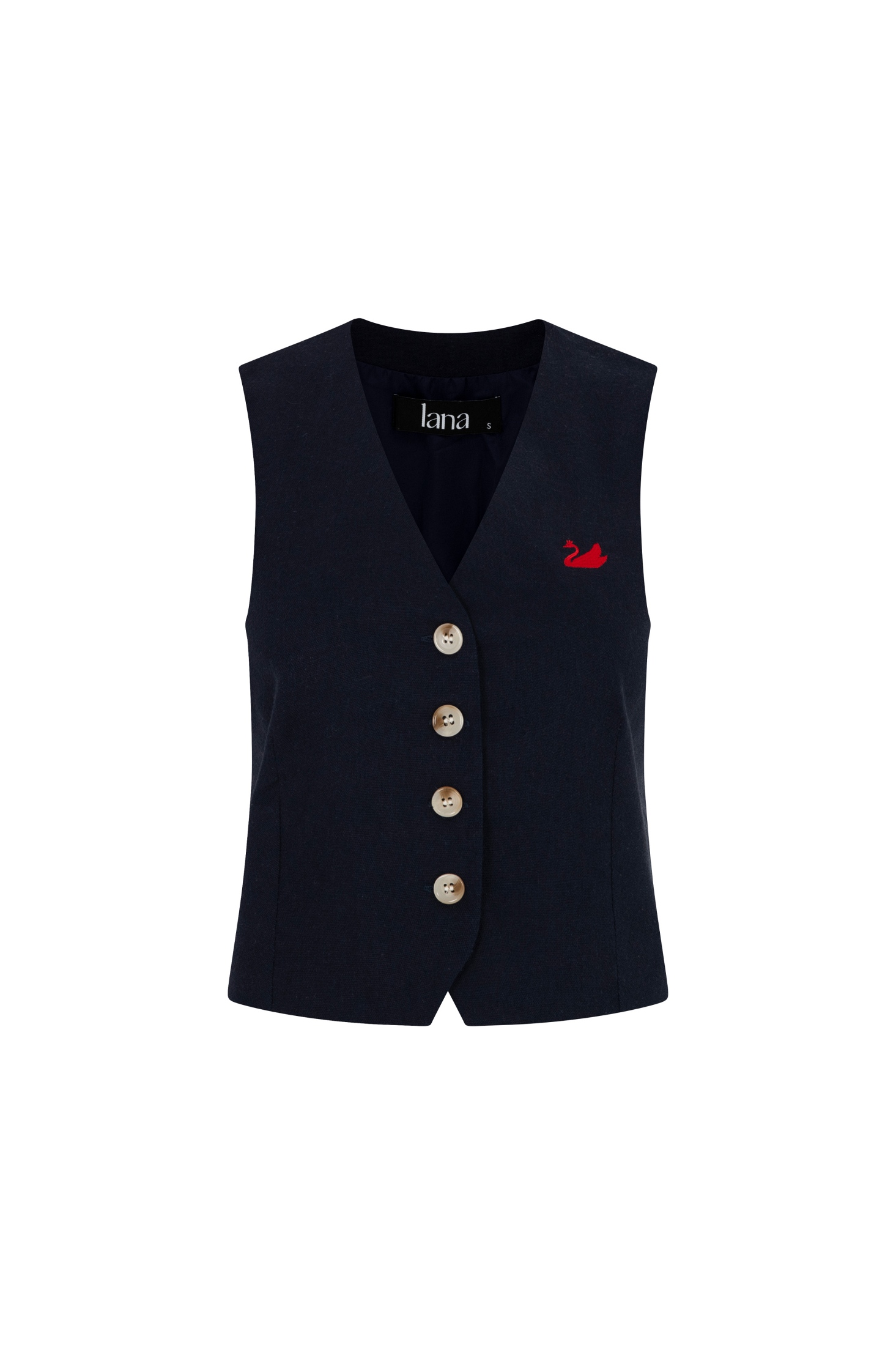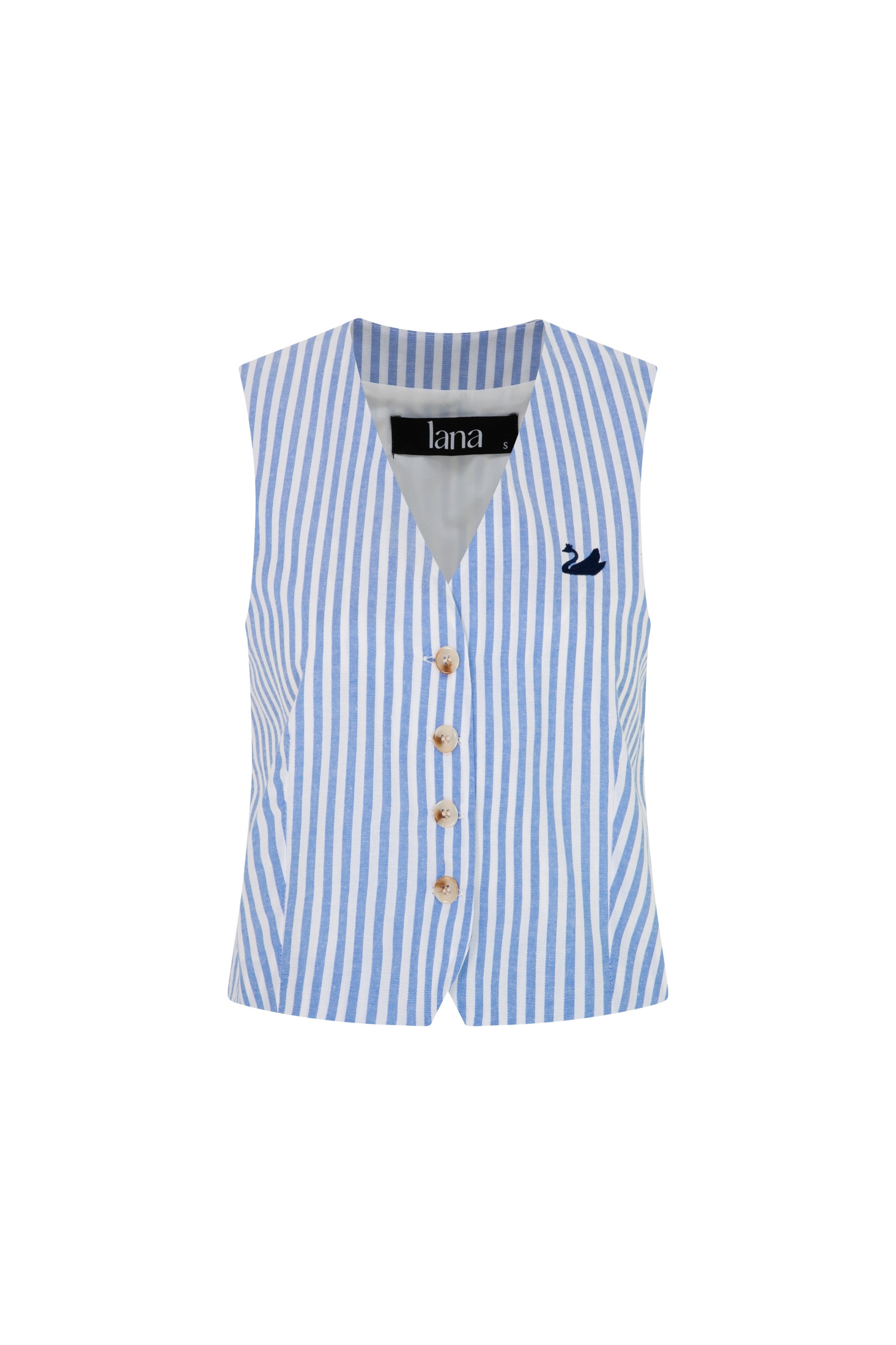 *Thông tin sản phẩm: Áo gile linen dáng crop, sọc xanh trendy mùa hè, may 2 lớp dày dặn. Có dây điều chỉnh eo phía sau.